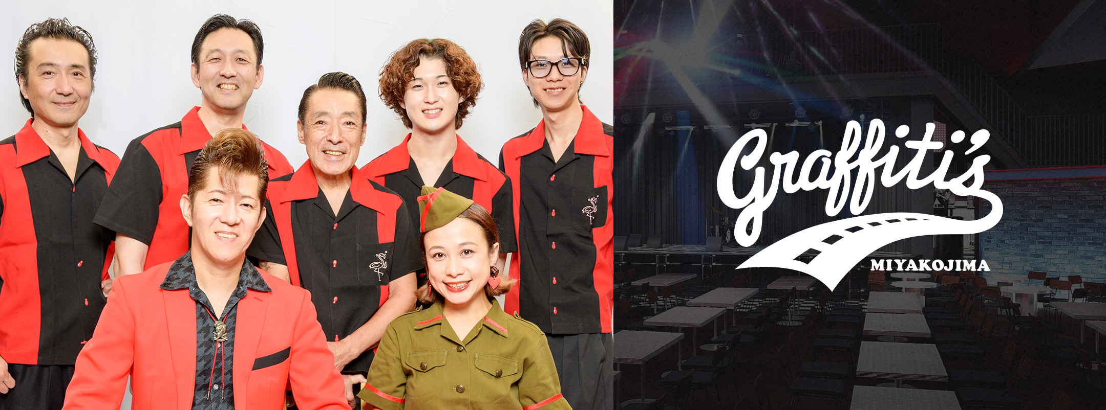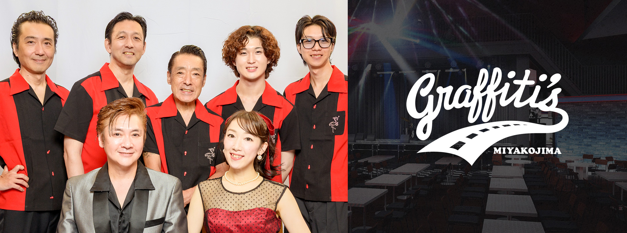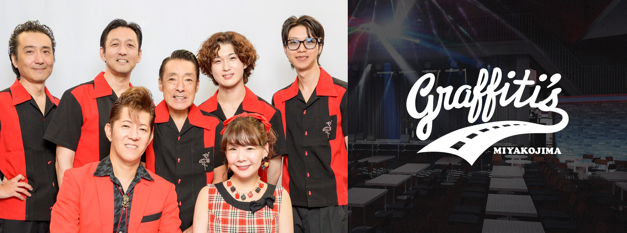 「MIYAKOJIMAグラフィティーズ」はCONNY’S COMPANYがプロデュースする『Funky Flamingo』でしか出会えないアメリカの世界を体現するバンド。エネルギッシュな’50s〜’60sの〈Rock ‘n’ Rollの時代〉、’70s〜’80sの〈インターナショナルDiscoの時代〉など、誰もがつい口ずさむヒット曲の数々を取り入れたステージは、老若男女を問わず幅広い層の方々にお楽しみいただけます。臨場感あふれるエキサイティングな一夜にぜひご期待ください。